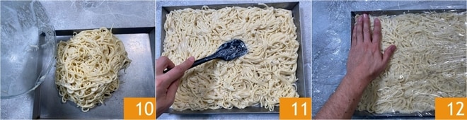 Transférez les pâtes ainsi assaisonnées sur une plaque 10 et répartissez-les uniformément 11, puis couvrez de film plastique au contact 12. Laissez revenir à température ambiante, puis placez au réfrigérateur pour raffermir au moins 2 heures.