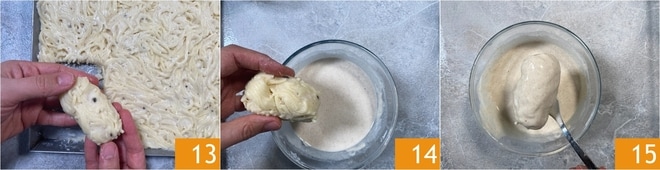 Après le temps de refroidissement, reprenez les pâtes du frigo, prélevez une partie du mélange avec les mains mouillées et façonnez-la en forme de cylindre 13. Plongez le supplì dans la pâte à frire 14 et laissez égoutter l'excès à l'aide d'une fourchette 15.