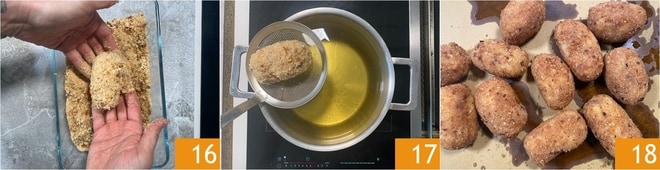 Passez le supplì recouvert de pâte à frire dans la chapelure rustique 16 et procédez ainsi pour former tous les autres ; avec ces doses, vous en obtiendrez une dizaine. Vous êtes prêts à frire : immergez délicatement 1-2 supplì à la fois dans l'huile de graines à une température de 160° 17 et faites-les frire environ 4 minutes jusqu'à ce qu'ils soient dorés et croustillants. Égouttez sur du papier absorbant 18 et dégustez vos supplì cacio e pepe encore chauds !