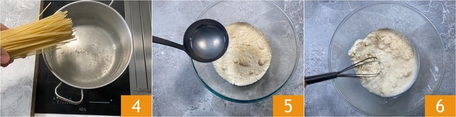 Pendant ce temps, portez à ébullition une casserole d'eau légèrement salée et faites cuire les tonnarelli al dente 4. Versez une louche d'eau de cuisson dans un bol où vous avez précédemment mélangé le pecorino et le parmesan râpés 5, puis mélangez énergiquement avec le fouet 6.