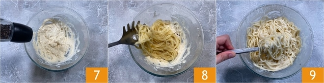 Ajoutez une généreuse mouture de poivre noir 7, puis égouttez-y les tonnarelli 8 et mélangez bien le tout 9.