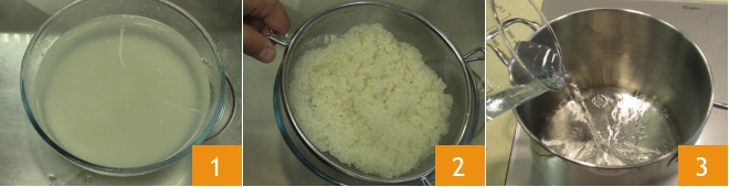 Pour préparer le riz pour le sushi maison, commencez par rincer soigneusement le riz nishiki à l'eau froide 1 pour éliminer les impuretés. Vous devrez changer l'eau froide jusqu'à ce qu'elle devienne claire. Ensuite, laissez-le tremper pendant une heure. Égouttez-le et laissez-le reposer dans la passoire placée sur un autre bol pendant 5 minutes 2. Dans une casserole à bords hauts, versez 500 g d'eau 3.