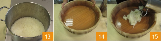 Maintenant que le riz est prêt, prenez l'hangiri (ou à défaut un récipient bas et large en bois ou en un autre matériau autre que l'acier), cela sert à assaisonner le riz. Humidifiez-le avec de l'eau 14, puis videz-le : de cette manière, le bois n'absorbera pas le vinaigre. Versez le riz à l'intérieur 15.