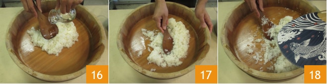 Une fois assaisonné, transférez le riz dans l'ohitsu 19, le récipient en bois pour maintenir la température du riz. Couvrez-le avec un papier absorbant humide pour maintenir une chaleur constante 20. En alternative, vous pouvez utiliser un récipient en bois ou en acier recouvert d'un tissu humide. Lorsque le riz sera à une température d'environ 36°, vous pourrez l'utiliser et le servir pour votre sushi 21.