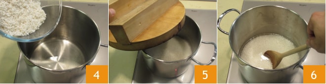 Ajoutez le riz propre 4. En général, le rapport riz-eau est de 1:1, mais selon la saison, cela peut varier : en automne, il en faudra moins, au printemps un peu plus. Allumez le feu et couvrez la casserole avec un couvercle : nous avons utilisé un couvercle en bois 5, mais vous pouvez en utiliser un classique. Lorsque ça commence à bouillir, remuez une seule fois le riz avec une cuillère en bois 6 pour obtenir une cuisson uniforme. Faites cuire à feu moyen pendant 5 minutes, puis baissez le feu et faites cuire 7 minutes supplémentaires à feu doux.