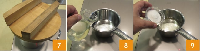À ce stade, retirez la casserole du feu sans enlever le couvercle et laissez reposer pendant 6 minutes supplémentaires. Ensuite, remettez la casserole sur le feu à feu moyen pendant 30 secondes supplémentaires 7. La consistance doit être légèrement al dente. Éteignez alors le feu. Préparez le mélange de vinaigre de riz, qui apportera une saveur légèrement acidulée. Dans une petite casserole, versez le vinaigre de riz 8 et ajoutez le sel 9. Faites chauffer à feu moyen-doux pour dissoudre le sel, jusqu'à ce qu'il atteigne l'ébullition 12.