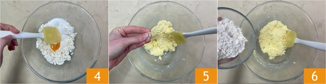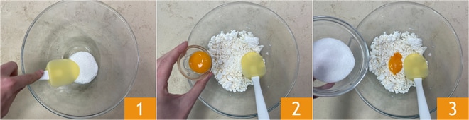 Pour réaliser les syrniki, mettez le fromage dans un bol et écrasez-le avec une maryse 1, puis ajoutez le jaune d'œuf 2 et le sucre 3.