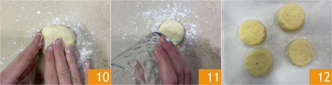Placez la boule sur le plan de travail, farinez légèrement la surface et aplatissez-la délicatement 10, puis aidez-vous d'un verre pour obtenir une forme ronde 11. Déposez les syrniki sur un plateau saupoudré de farine 12 et placez-les au congélateur pendant une heure.