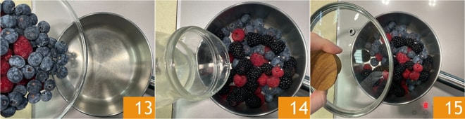 Entre-temps, préparez la sauce aux fruits rouges : versez dans une petite casserole les myrtilles, les framboises et les mûres 13, puis ajoutez un peu d'eau 14 et couvrez avec le couvercle 15.