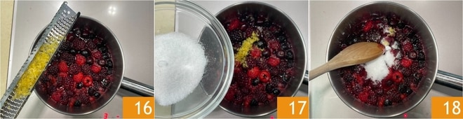 Allumez le feu moyen-doux, puis ajoutez le zeste de citron râpé 16 et le sucre 17. Cuisez pendant environ 15 minutes, en mélangeant de temps en temps 18.