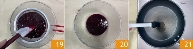 Après ce temps, tamisez la sauce aux fruits des bois 19 et laissez-la refroidir 20. Vous pouvez procéder à la cuisson : graissez une poêle antiadhésive avec de l'huile de graines 21 et chauffez-la bien.