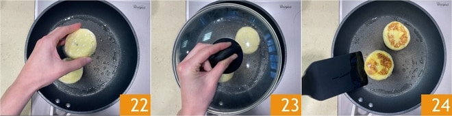 Déposez les syrniki 22, couvrez avec le couvercle 23 et cuisez pendant environ 3 minutes, en les retournant de chaque côté 24.