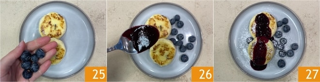 Servez les syrniki accompagnés de myrtilles fraîches 25 et de la sauce aux fruits des bois 26, en saupoudrant de sucre glace si vous le souhaitez 27 !