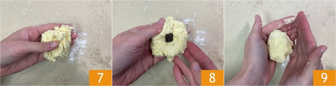 Saupoudrez le plan de travail d'un peu de farine, puis prélevez un quart du mélange et aplatissez-le légèrement dans la paume d'une main 7. Insérez au centre un cube de chocolat noir 8 et modelez le mélange pour former une boule 9.