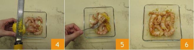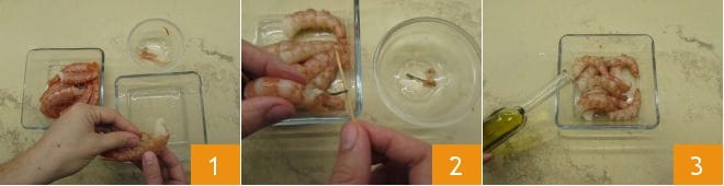 Pour préparer les tacos avec kale et crevettes, commencez par ces dernières. Enlevez la carapace des queues de crevettes 1 et à l'aide d'un cure-dent, extrayez délicatement le filament noir 2, sans le casser. Au fur et à mesure, transférez-les dans un bol, puis assaisonnez-les avec du sel, 20 g d'huile 3