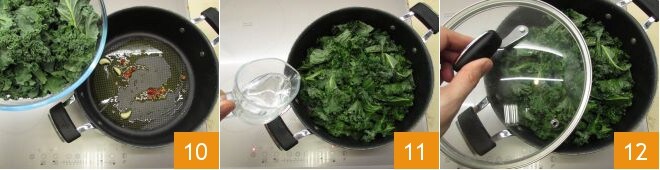 Ajoutez le chou kale 10, laissez parfumer pendant 1 minute, puis ajoutez l'eau chaude 11 et mélangez à nouveau. Salez, couvrez avec un couvercle 12 et laissez cuire environ 8 minutes.