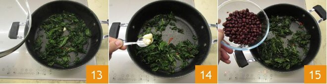Quand le chou kale sera fané 13, retirez les gousses d'ail 14 et ajoutez les haricots égouttés 15. Laissez parfumer pendant quelques minutes.