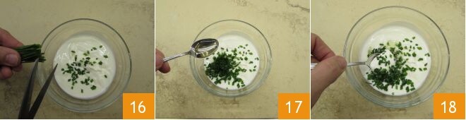 Entre-temps, préparez la sauce : versez le yaourt grec dans un bol, ajoutez la ciboulette hachée 16, le miel 17, l'huile et une pincée de sel. Mélangez le tout 18.