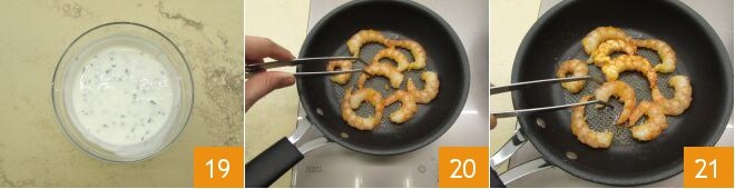 Mettez la sauce de côté 19 et passez à la cuisson des crevettes. À feu vif, chauffez une poêle et ajoutez les crevettes 20. Attendez environ 1 minute, puis retournez-les de l'autre côté 21 et terminez la cuisson pendant une autre minute.