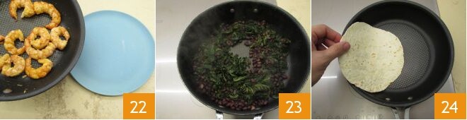 Transférez les crevettes dans une assiette 22. À ce stade, le chou kale sera également prêt 23. Chauffez dans une poêle la première tortilla 24.