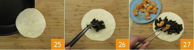 Transférez la tortilla sur une planche à découper 25 et placez au centre un peu de chou kale, en veillant à prendre également les haricots 26. Placez les crevettes dessus 27