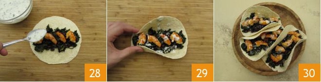 et terminez avec la sauce 28. Pliez légèrement la tortilla en deux 29 et procédez de la même manière pour assembler les autres tacos avec kale et crevettes 30.