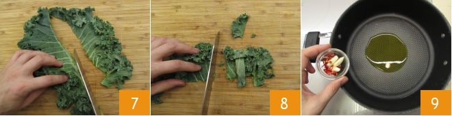 Passez au chou kale, coupez chaque feuille d'abord en deux 7 puis en lanières 8. Dans une poêle, chauffez un filet d'huile avec 2 gousses d'ail et un piment haché 9.