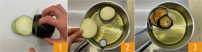 Pour préparer les tacos d'aubergine, commencez par équeuter l'aubergine et la couper en tranches d'environ 1 cm d'épaisseur 1. Chauffez l'huile de graines à une température de 170°-175°, plongez 2-3 tranches d'aubergine à la fois 2 et faites frire jusqu'à ce qu'elles soient dorées 3. Égouttez sur du papier absorbant et réservez.