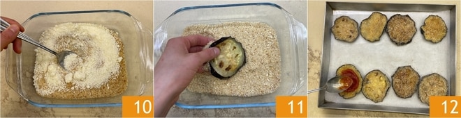 Mélangez pour bien amalgamer le tout 10, puis passez les aubergines frites dans ce mélange en veillant à recouvrir les deux côtés 11. Disposez les aubergines sur une plaque recouverte de papier cuisson et répartissez une cuillère à café de sauce tomate 12.