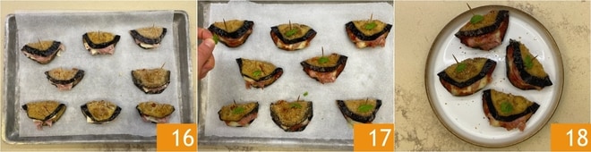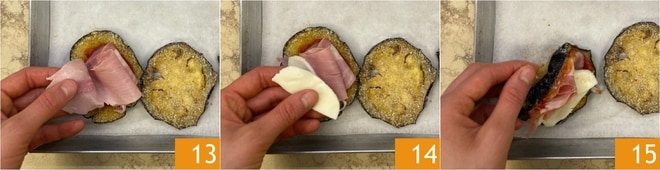 Ajoutez une tranche de jambon 13 et une de mozzarella 14. Pliez l'aubergine en deux et fixez-la avec un cure-dent 15.