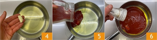 Occupons-nous maintenant de la sauce : dans une petite casserole, faites chauffer un filet d'huile avec une gousse d'ail 4, puis versez la purée de tomates 5 et salez 6.