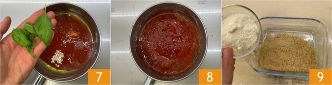 Parfumez avec quelques feuilles de basilic 7, mélangez et laissez cuire à feu moyen-doux pendant 5-10 minutes 8. Entre-temps, coupez la mozzarella en tranches, puis préparez la panure en versant la chapelure et le parmesan dans un plat 9.