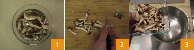 Pour préparer les tagliatelles au ragù de champignons et fruits secs, commencez par mettre les cèpes à tremper. Versez-les dans un bol rempli d'eau fraîche 1. En attendant, nettoyez les champignons : enlevez la partie terreuse 2 puis rincez-les. Enfin, blanchissez-les pendant environ 15 minutes 3.