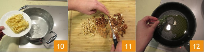 Entre-temps, mettez sur le feu une casserole pour cuire les pâtes 11 et en même temps préparez le reste : hachez les fruits secs 11. Dans une poêle, versez un peu d'huile et aromatisez avec de l'ail et du romarin 12,