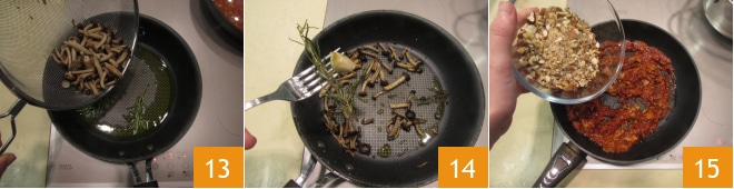 puis égouttez les champignons qui à ce stade devraient être cuits 13. Assaisonnez rapidement et retirez l'ail et le romarin 14. La sauce devrait aussi être prête maintenant, ajoutez 3/4 du mélange de fruits secs 15