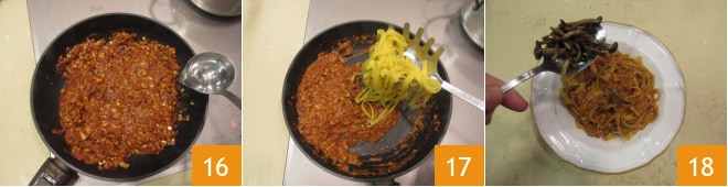 et si besoin, allongez avec un trait d'eau de cuisson des pâtes 16. Ensuite, égouttez les tagliatelles et mélangez 17. Servez en versant les pâtes dans les assiettes et en garnissant avec les champignons 18.