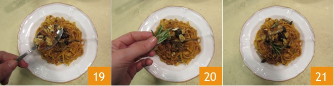 Ajoutez le mélange de fruits secs 19, quelques aiguilles de romarin 20 et vos tagliatelles au ragù de champignons et fruits secs sont prêtes, bon appétit 21.