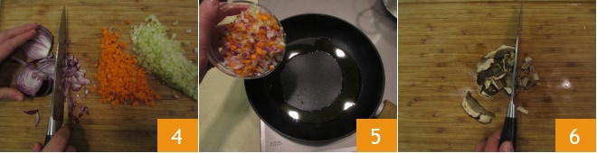 Entre-temps, nettoyez et hachez finement au couteau, l'oignon, le céleri et la carotte 4. Dans une poêle, chauffez un bon filet d'huile puis ajoutez le hachis. Laissez-le fondre à feu doux pendant une dizaine de minutes 5. Pendant ce temps, égouttez les cèpes et hachez-les grossièrement 6.