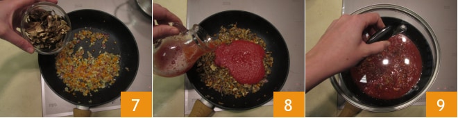 À ce stade, la friture devrait être ramollie, ajoutez les cèpes et ajustez le sel 7, puis ajoutez la purée de tomates 8, rincez le pichet en ajoutant ainsi un trait d'eau à la sauce, et couvrez en laissant cuire pendant 15 minutes avec le couvercle 9.