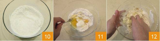 Poursuivez maintenant avec la préparation des pâtes fraîches. Prenez un bol et versez la farine tamisée 10. Formez une fontaine avec la farine et, après avoir fait un petit creux au centre, versez les œufs 11 et rectifiez avec une pincée de sel. Commencez à mélanger les ingrédients, en incorporant petit à petit la farine aux œufs et en élargissant ainsi le cercle 12. Lorsque vous avez incorporé tous les ingrédients, prenez la pâte et placez-la sur un plan de travail. Pétrissez-la avec les mains pendant au moins 10 minutes jusqu'à obtenir une pâte souple et homogène.