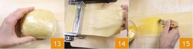 Formez une boule que vous devez ensuite envelopper avec du film plastique 13. Prenez maintenant la pâte aux œufs et étalez-la à l'aide d'un rouleau à pâtisserie, puis réalisez deux feuilles de pâte aussi fines que possible, en utilisant une machine à pâtes 14. Badigeonnez les deux feuilles de pâte avec l'œuf battu (cela facilitera l'adhérence de la farce) 15,