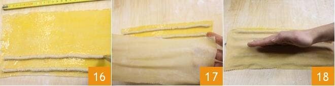 puis prenez la poche à douille et déposez des bandes de farce d'environ 30 cm de long, en les espaçant d'environ 1 cm les unes des autres 16. Laissez également une bordure supérieure et inférieure d'environ un demi-centimètre, qui servira à fermer les tagliatelles. Prenez la deuxième feuille de pâte aux œufs et déposez-la sur la première 17. Il est important que les tagliatelles soient fermées sans laisser d'air à l'intérieur, vous devrez donc exercer une pression avec la main, de chaque côté de la farce, pour les sceller et faire sortir tout l'air 18.