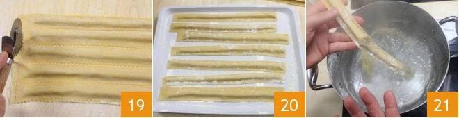 Coupez maintenant les tagliatelles en utilisant une roulette crantée 19, puis placez-les sur un plateau légèrement fariné 20. Pendant ce temps, portez à ébullition une grande quantité d'eau salée et faites cuire les tagliatelles pendant 4 à 5 minutes, puis égouttez-les et réservez-les 21.