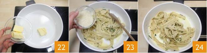 Dans une poêle antiadhésive, faites fondre le beurre 22 et ajoutez les tagliatelles farcies : faites-les sauter pendant quelques minutes et assaisonnez-les, en ajoutant un hachis d'herbes aromatiques (thym, origan, ciboulette et sauge) et une bonne quantité de Parmigiano Reggiano 23. Mélangez avec précaution pour ne pas casser les pâtes farcies tout en amalgamant tous les ingrédients, puis servez les tagliatelles farcies encore chaudes 24.