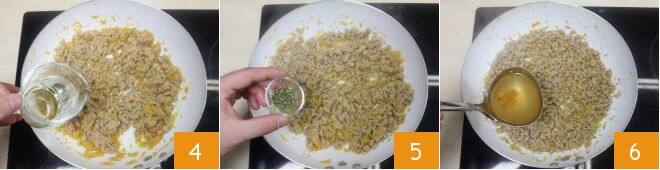 puis déglacez avec le vin blanc 4. Ajoutez à la viande un hachis de romarin 5 et le bouillon 6, petit à petit, puis rectifiez le sel et le poivre et poursuivez la cuisson à feu moyen pendant environ 40 minutes.