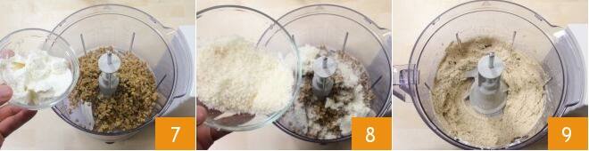 Lorsque la viande est prête, laissez-la refroidir, puis placez-la dans un mixeur avec la ricotta 7 et le Parmigiano Reggiano 8. Mixez le tout 9 et déposez le mélange dans une poche à douille munie d'une douille lisse, à petit trou.