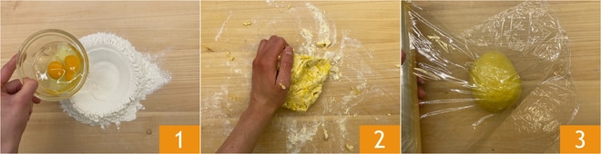 Pour préparer les tagliatelles aux fleurs de courgette, commencez par disposer la farine en fontaine sur un plan de travail et versez les œufs au centre 1. Pétrissez 2 jusqu'à obtenir une pâte lisse et homogène. Couvrez avec du film plastique 3 et laissez reposer au réfrigérateur pendant 30 minutes.