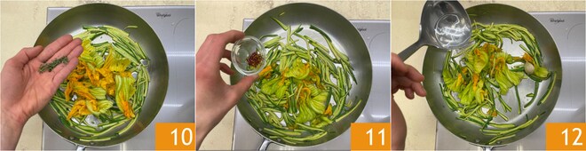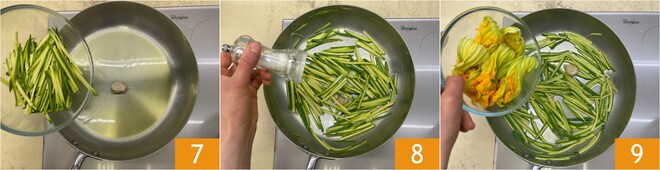 Dans une poêle, versez un filet d'huile, ajoutez l'ail et les courgettes 7, assaisonnez de sel et de poivre 8 et faites sauter pendant 2-3 minutes. Ajoutez ensuite les fleurs de courgette 9.