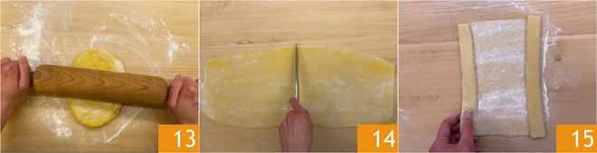 Reprenez la pâte et étalez-la avec un rouleau à pâtisserie 13 jusqu'à obtenir une abaisse d'environ 1-2 mm d'épaisseur. Coupez l'abaisse en deux 14 et, en partant des extrémités, roulez-la vers le centre 15. Répétez cette opération pour chaque abaisse.