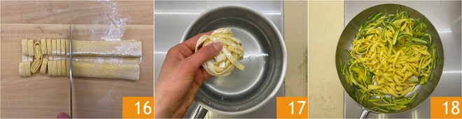 Coupez les rouleaux en bandes d'environ 5 mm de large 16. Plongez les tagliatelles dans une grande quantité d'eau bouillante salée 17. Une fois cuites, égouttez-les, transférez-les dans la poêle et faites-les sauter pendant quelques minutes 18.